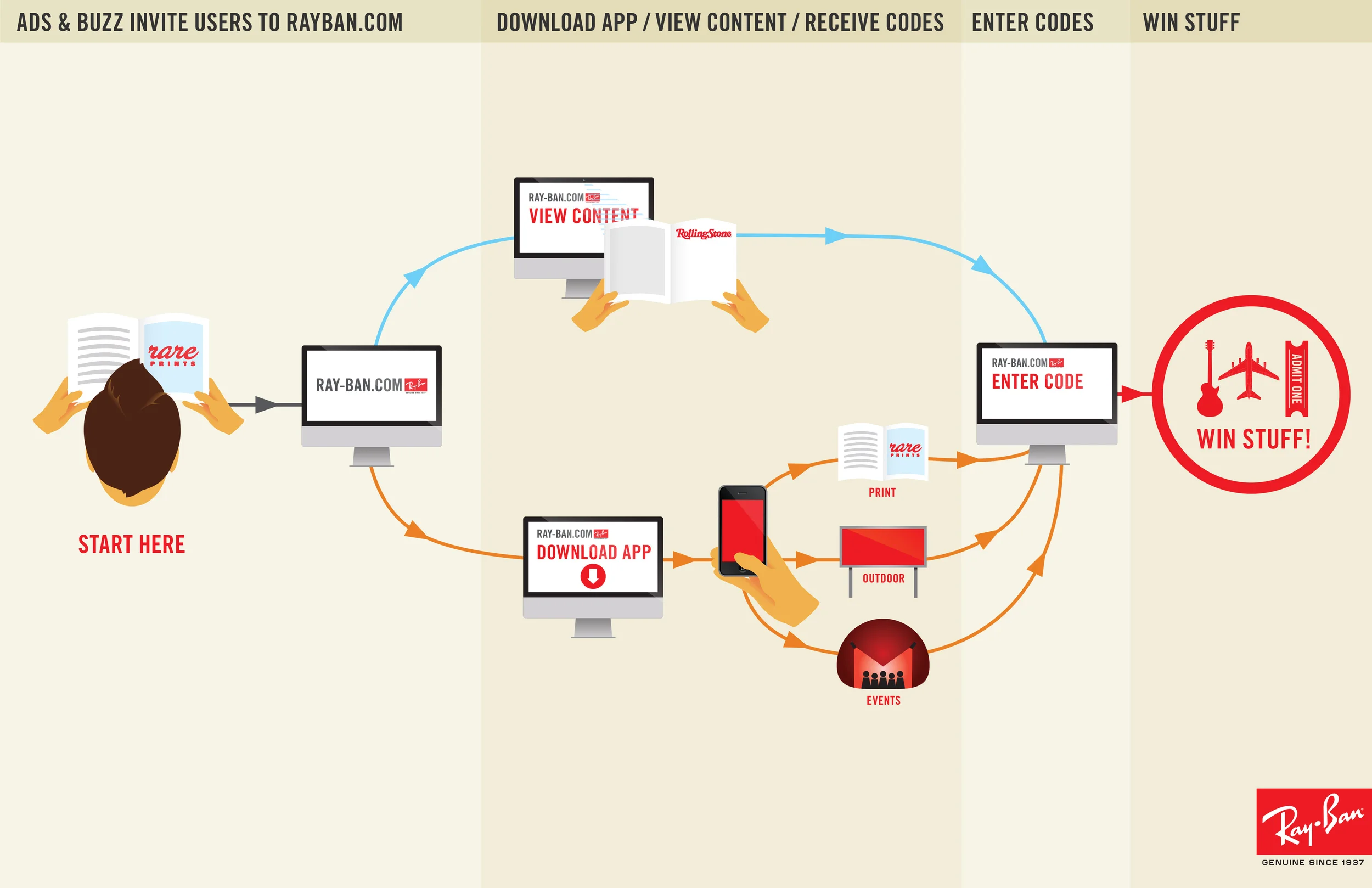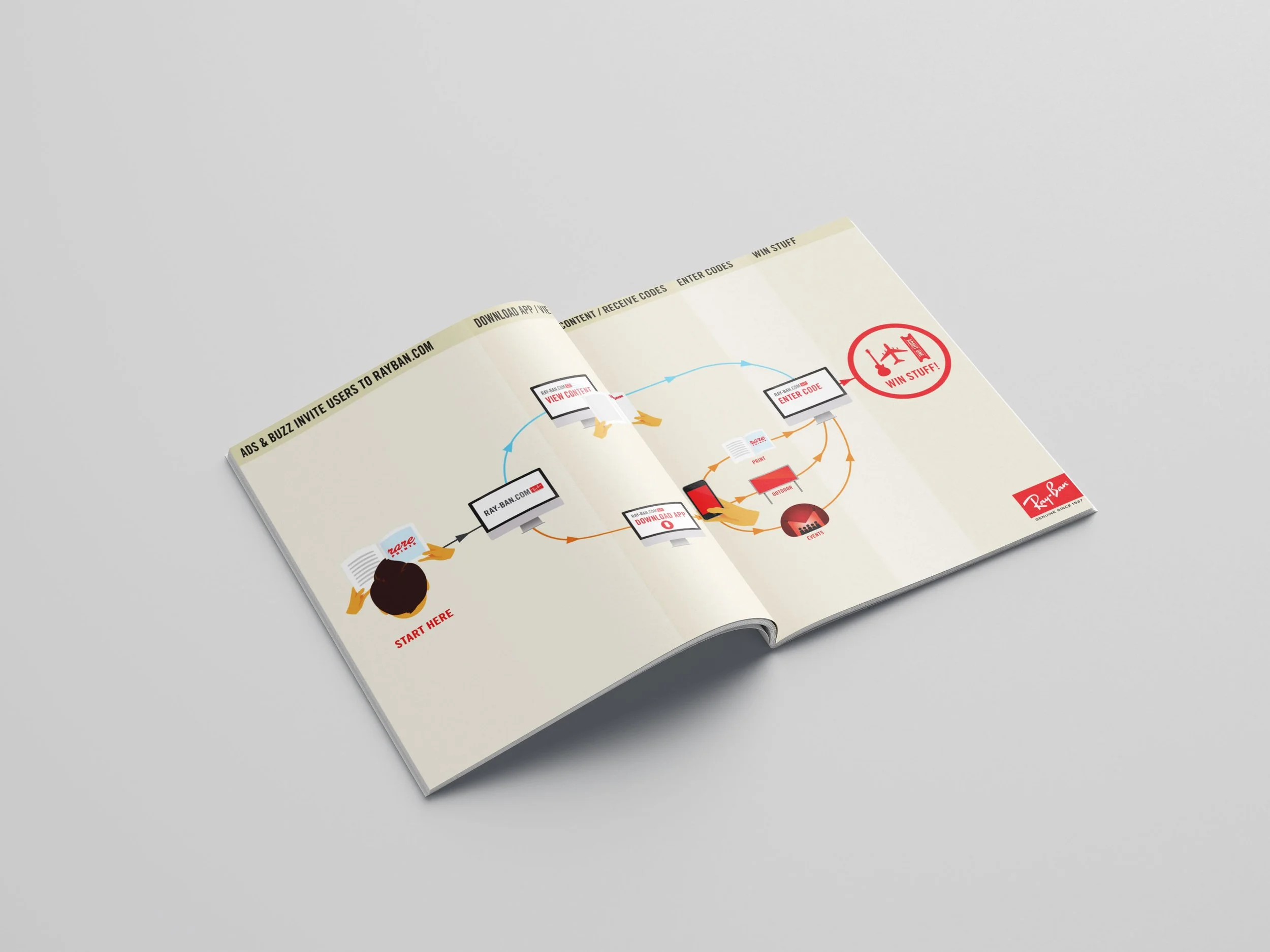 Ray-Ban Rare Prints (Augmented Reality Campaign) — A digital and print ecosystem designed to bring Ray-Ban’s Rare Prints collection to life through augmented reality. The visuals map how users engage across print, mobile, and web, creating an interactive experience that bridges traditional and digital media.